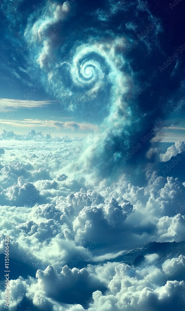 Fiolet - Swirling clouds create a mesmerizing spiral pattern in the blue sky above a vast landscape #1151606422