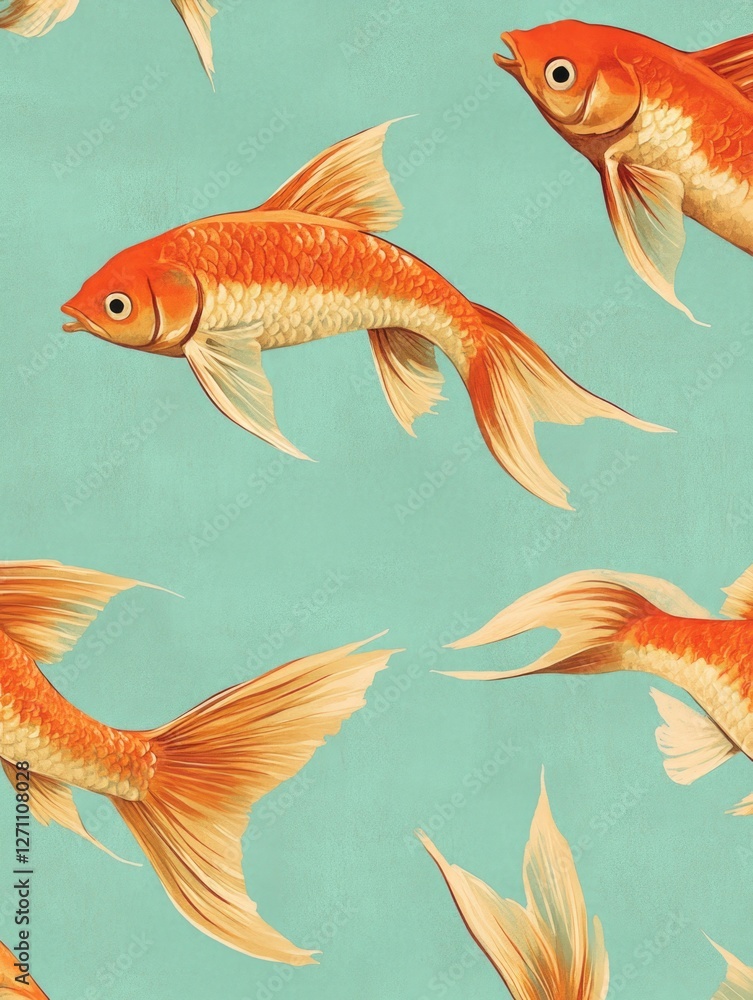 • An illustration of several goldfish swimming in a patterned aquarium.