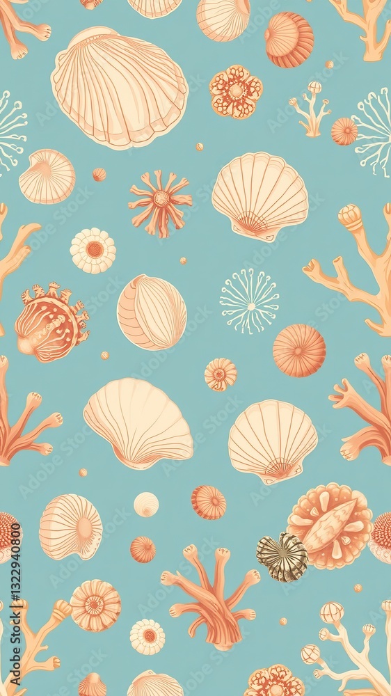 • Elegant pattern featuring beautiful seashells in various sizes and colors on a soft background