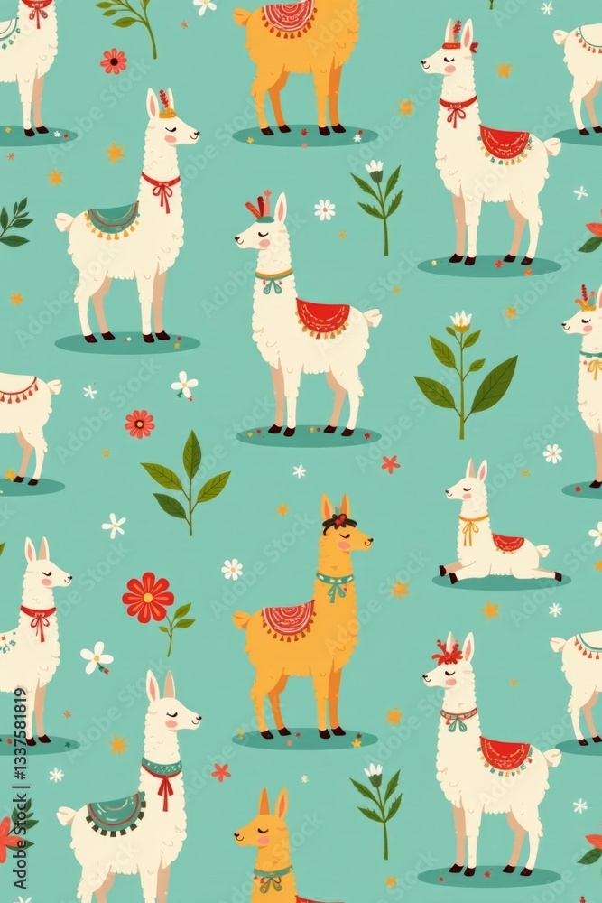 • Whimsical design featuring llamas practicing yoga in a seamless pattern, animals, relaxation