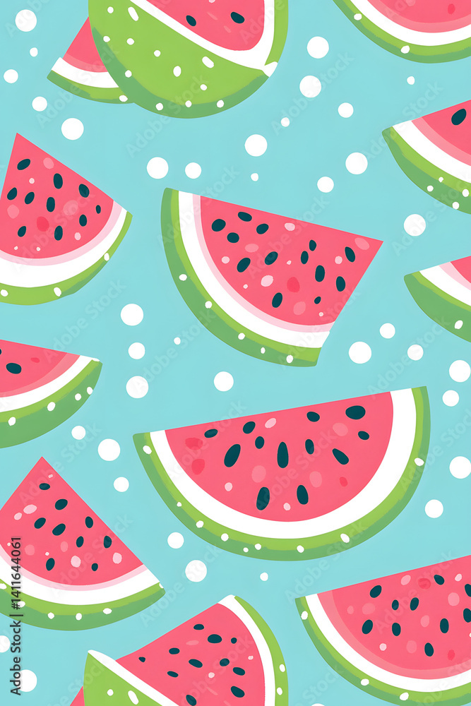 • Cute illustrated watermelon pattern on turquoise background, ideal for summer, kids, and playful design themes.