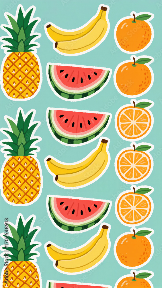 • A vertical, seamless, and colorful graphic background. The image is a fun and fresh pattern of various fruits, including pineapples, watermelon slices, bananas, and oranges.