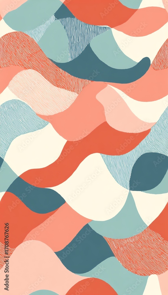 • seamless geometric wave pattern with vintage aesthetic, repeating curved lines in retro coral, aqua, and cream, mid-century texture overlay