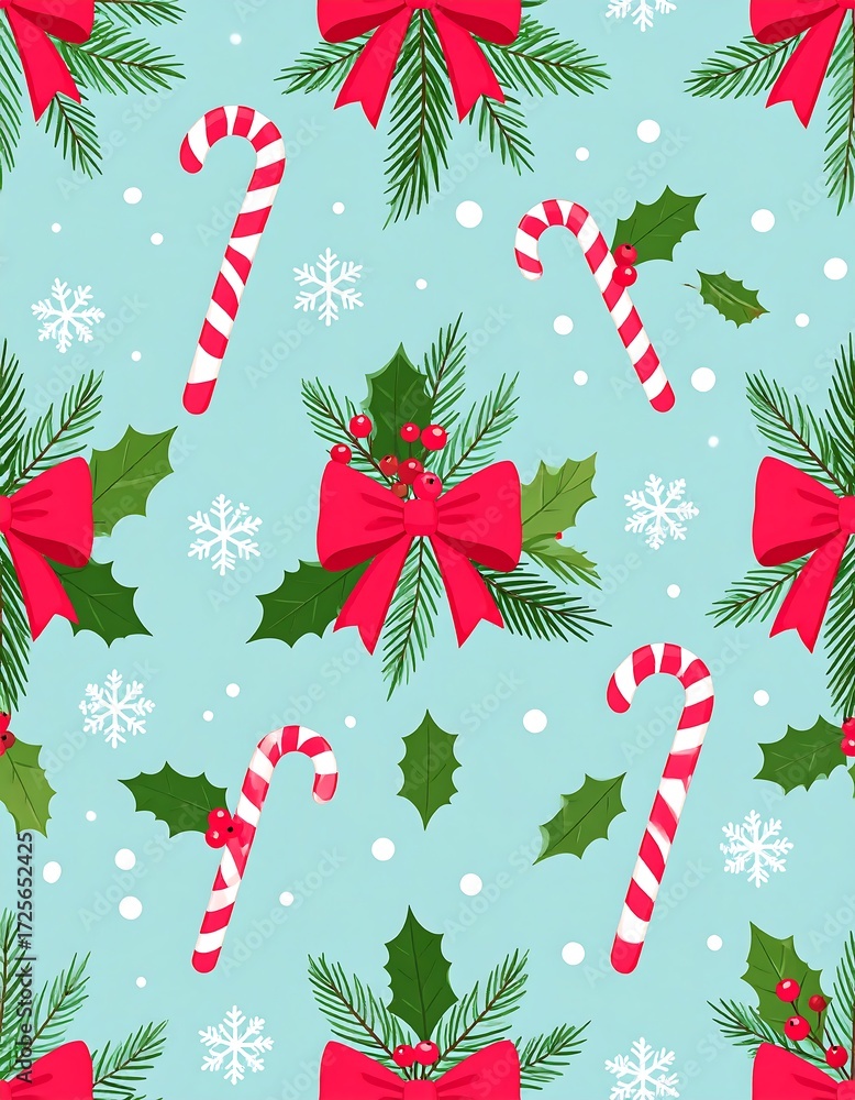• Christmas pattern with candy canes, holly, bows, and snowflakes