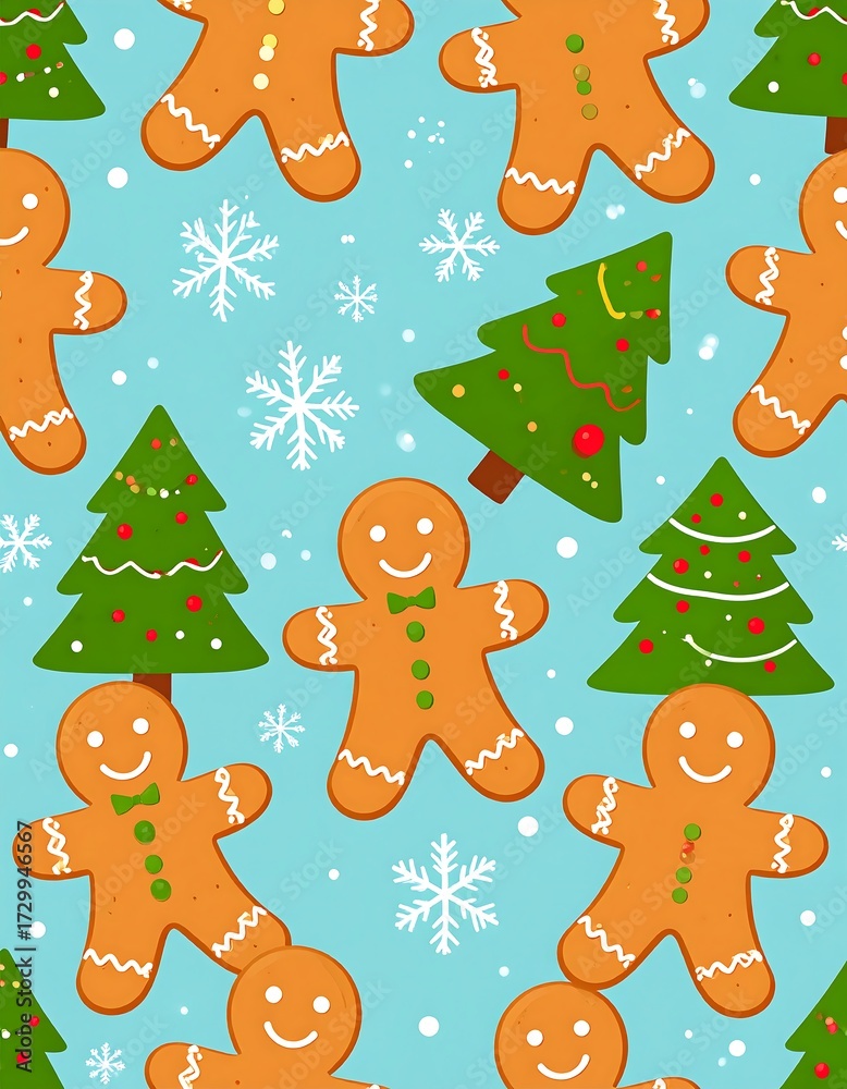 • Seamless pattern of gingerbread men and decorated Christmas trees on a light blue background with snowflakes