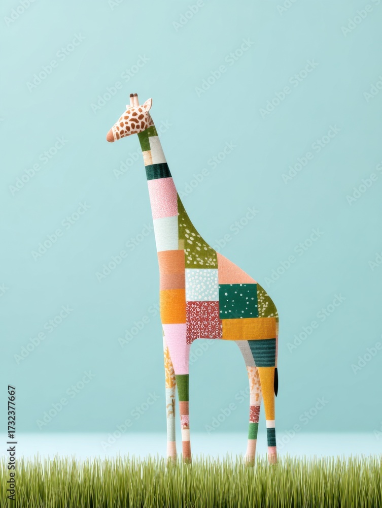 • Colorful giraffe sculpture stands on green grass against light blue background showcasing vibrant, quilt-like pattern and playful design suitable for decorative display or children's room decor