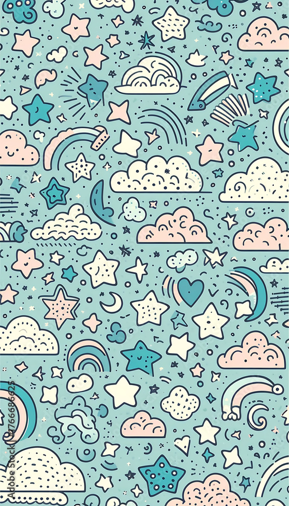• Cute nursery sky seamless pattern — clouds, stars, and rainbows, teal & coral