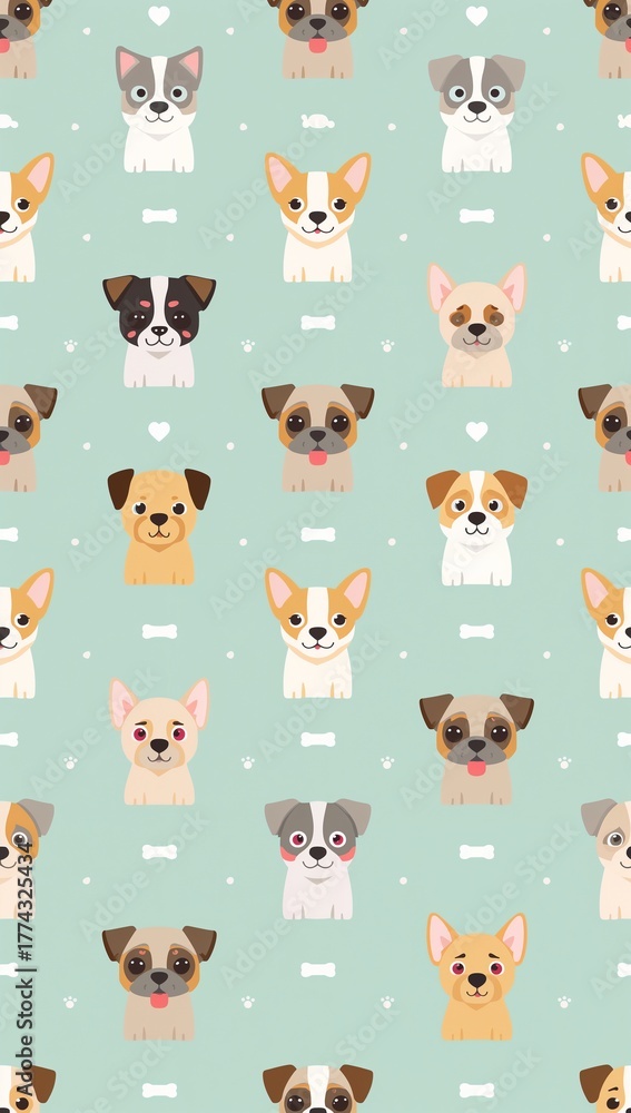 • Adorable dog pattern featuring cute cartoon puppy faces on a soft teal background design