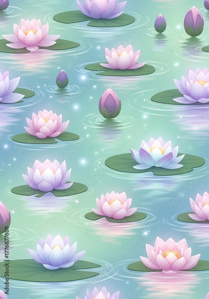 • Serene water lily pond, pastel reflections, floating blossoms pattern