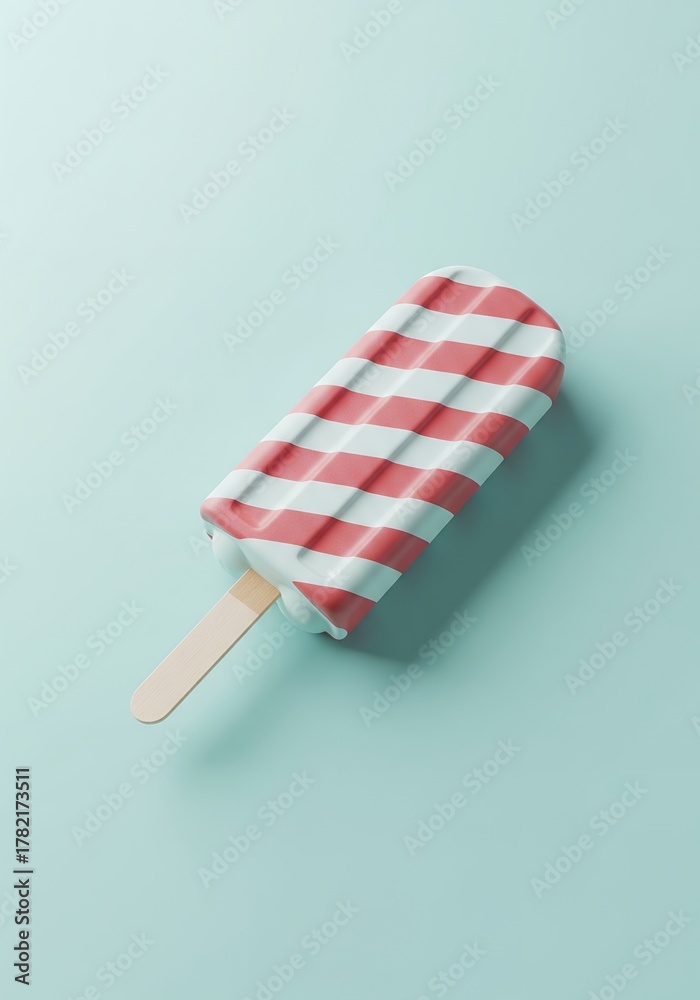 • Striped ice cream popsicle with red and white candy cane pattern on pastel blue background
