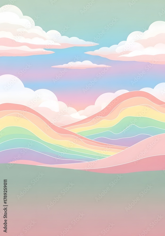 • A pastel rainbow arches over rolling hills under a soft, cloudy sky, evoking a sense of fantasy and dreams
