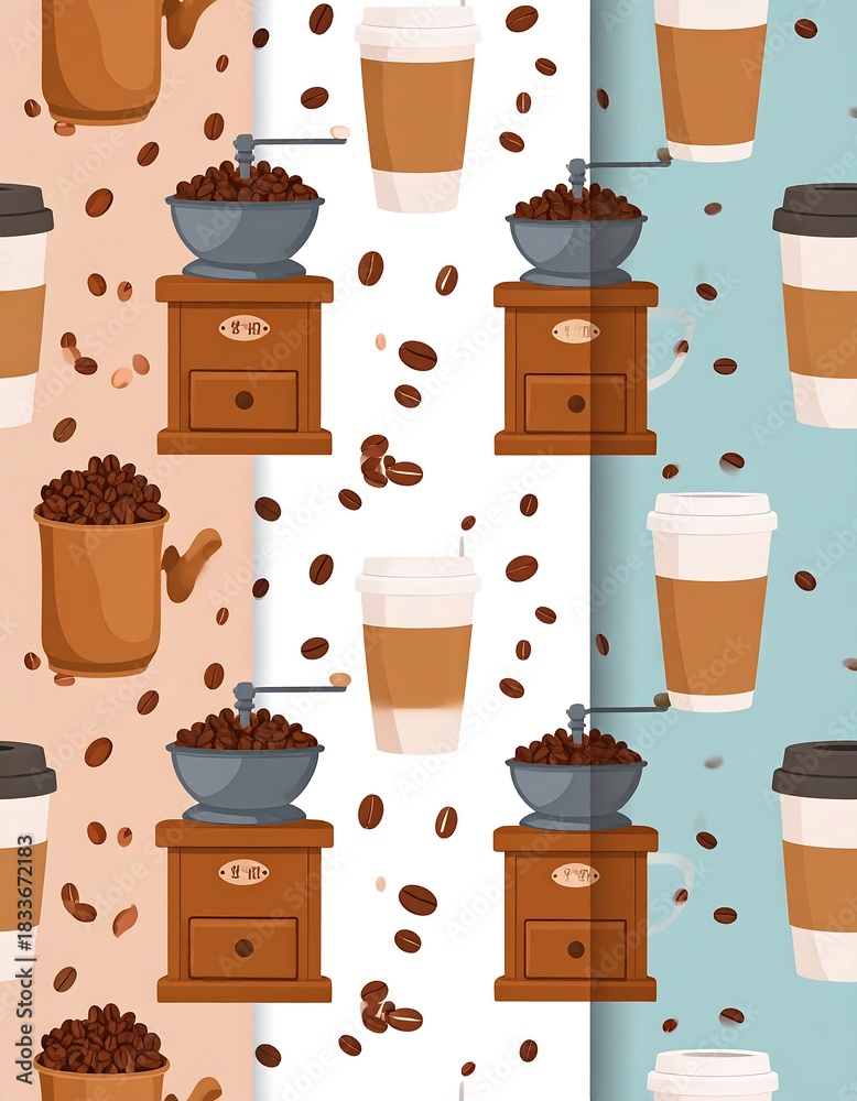 • Cartoon-style repeating pattern featuring coffee grinders, to-go cups, and scattered coffee beans in three distinct color blocks
