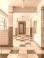 • Colorful corridor interior geometric pattern retro hallway bright tiled wall checkerboard floor modern architecture empty school vivid color block