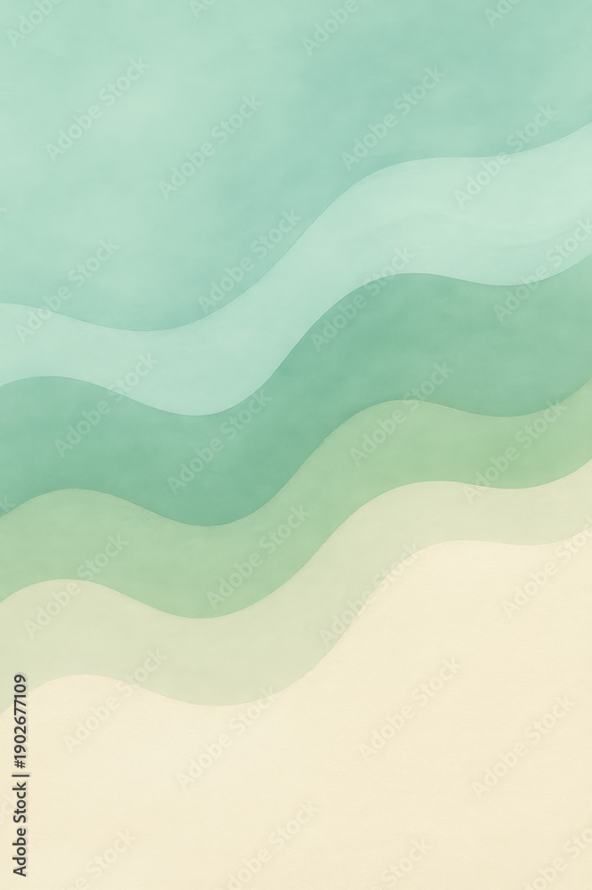 • Abstract design features flowing, layered waves in calming shades of mint, seafoam, and warm cream. The gentle gradients and subtle paper-like texture create a serene, modern composition.