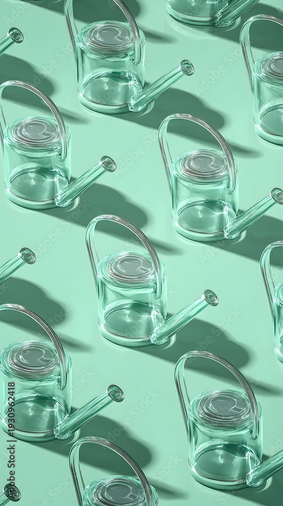Fiolet - Seamless pattern of transparent watering cans on a mint green background #1930962418