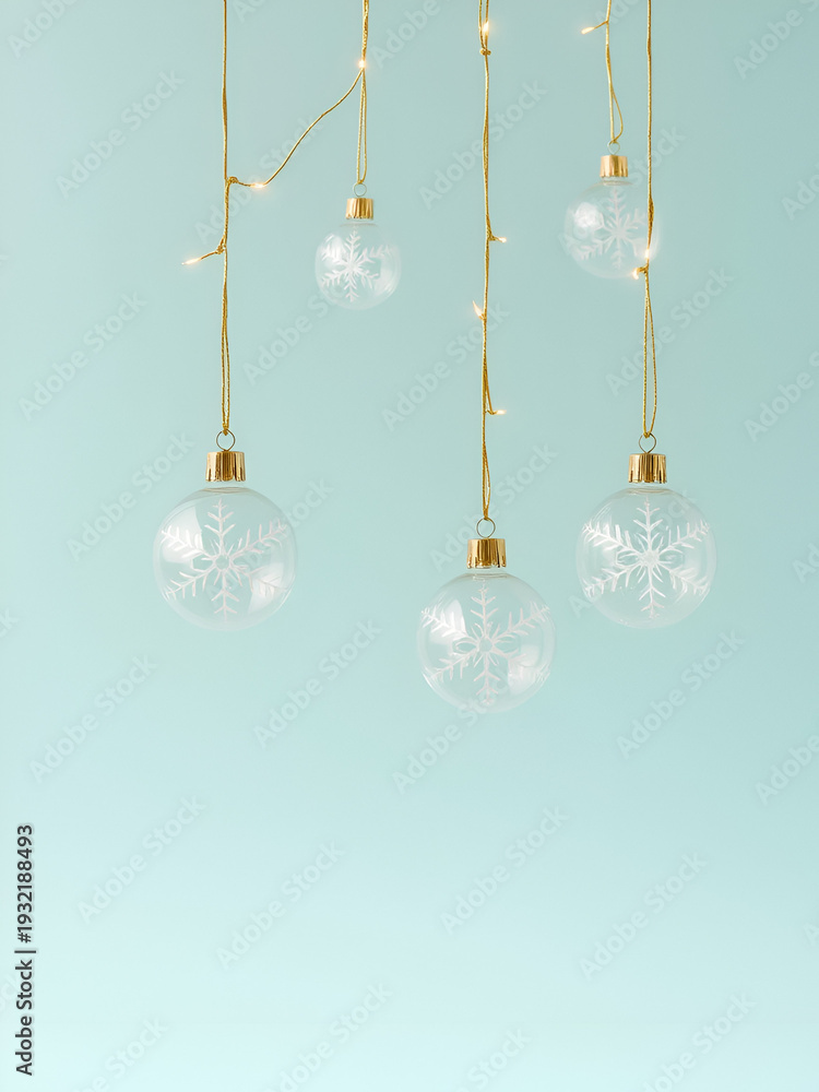 • Christmas ornaments with snowflake patterns hang from gold strings on a mint background, softly lit in a simple, elegant arrangement.