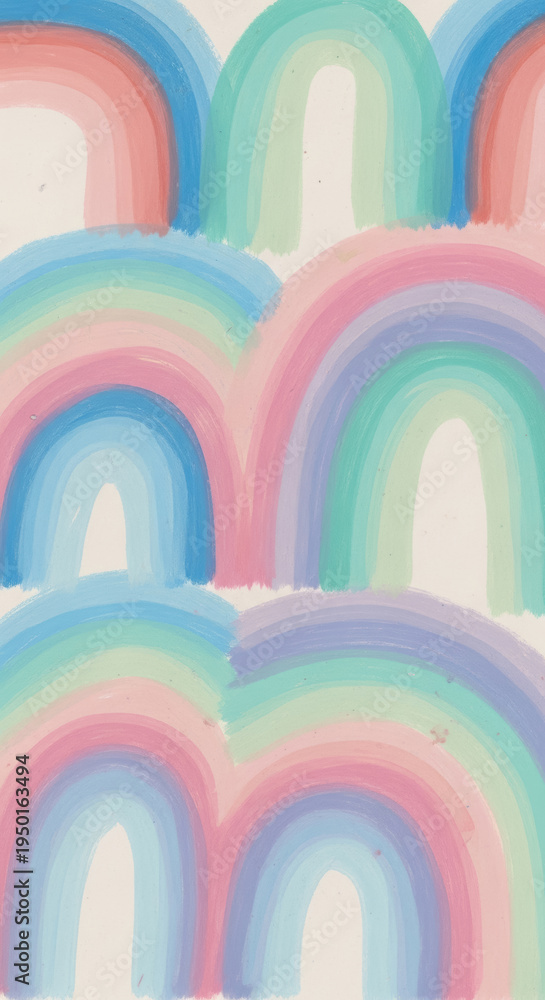 • Multiple overlapping watercolor rainbows in soft pastel tones create a cheerful, repeating pattern on a light surface.