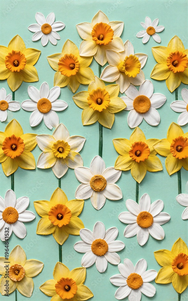 • Vibrant daffodils and daisies bloom in cheerful patterns on a soft