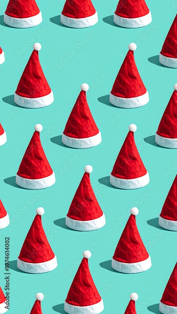 • A pattern of red and white Santa hats on a teal background