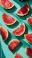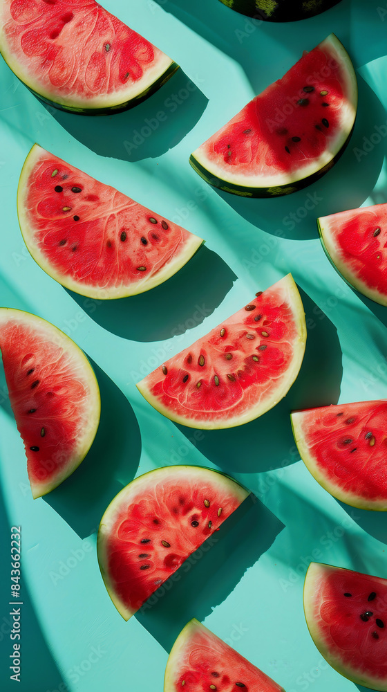 Fiolet - Aesthetic juicy slices of red watermelon on the pastel turquoise background with strong shadows.... #843662232