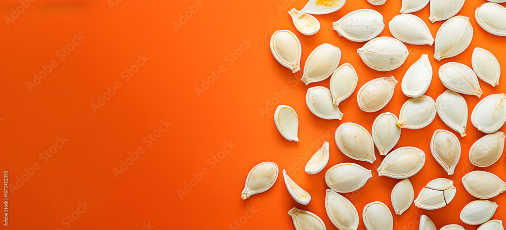 Jesień - Pestki dyni widok z góry na pomarańczowym tle z dużą przestrzenią na tekst. Koncept zdrowej... #1673452383