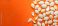 • Pestki dyni widok z góry na pomarańczowym tle z dużą przestrzenią na tekst. Koncept zdrowej przekąski i jesiennej dekoracji