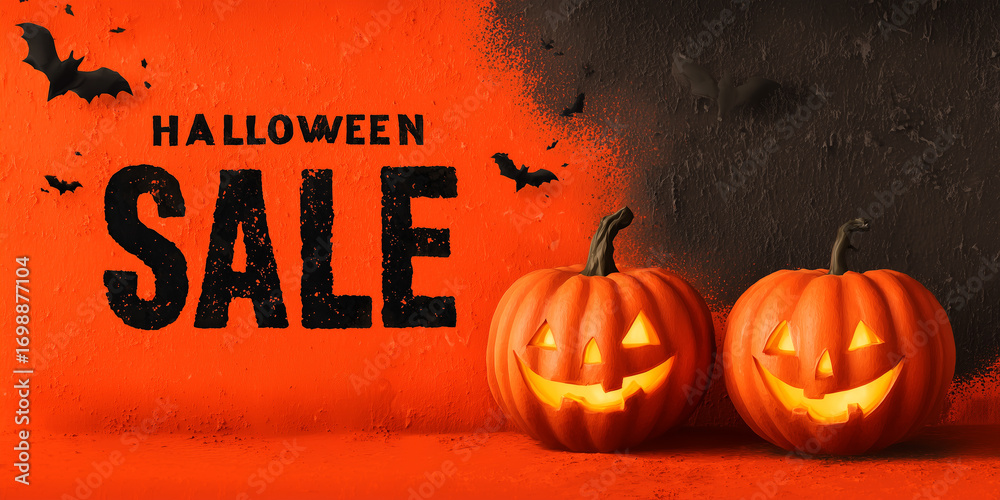 • Dwie, świecące dynie z wyrzeźbionymi twarzami, nietoperze i napis "Halloween Sale" na tle pomarańczowej ściany. Idealna grafika reklamowa.