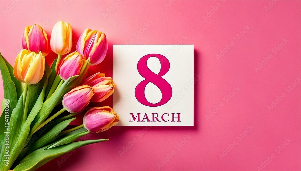 Różowy - Różowe tło z tulipanami i datą na dzień kobiet #1241190266