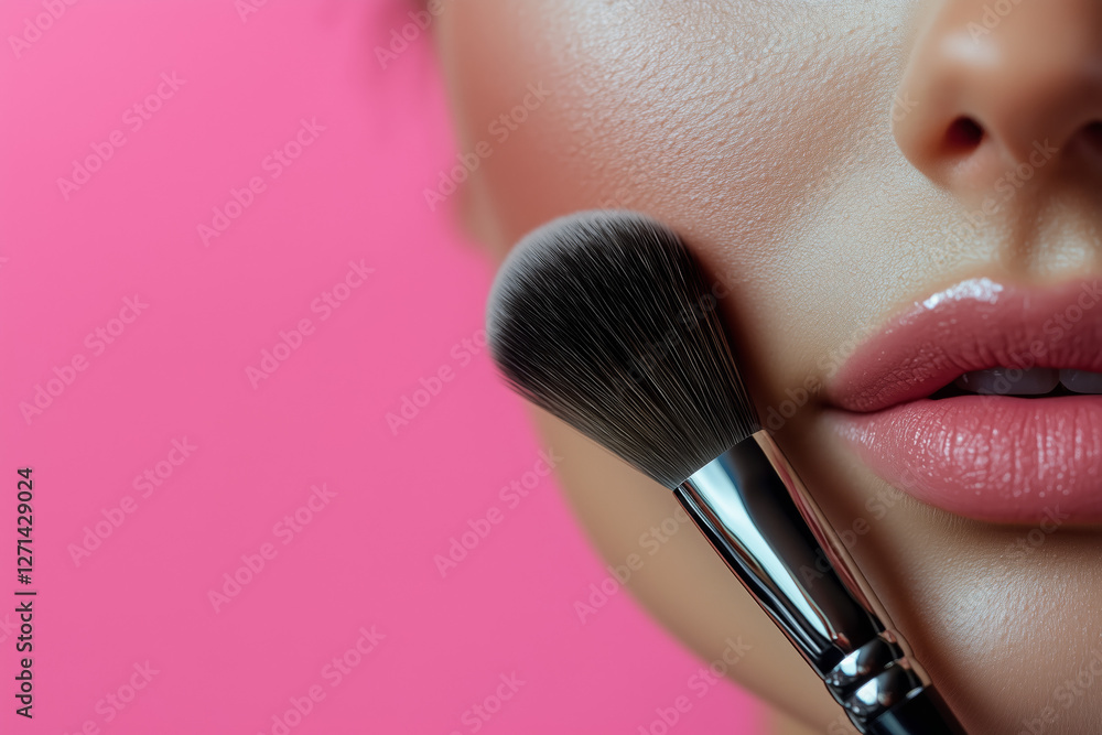 Różowy - Zbliżenie portretu kobiety nakładającej brokatowy makijaż pędzlem na różowym tle #1271429024
