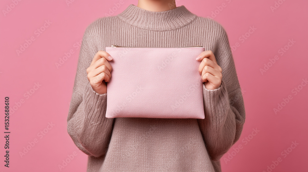 • Osoba w beżowym swetrze trzyma przed sobą gładką, różową kosmetyczkę lub etui, idealne do zaprezentowania własnego logo lub wzoru, na różowym tle.