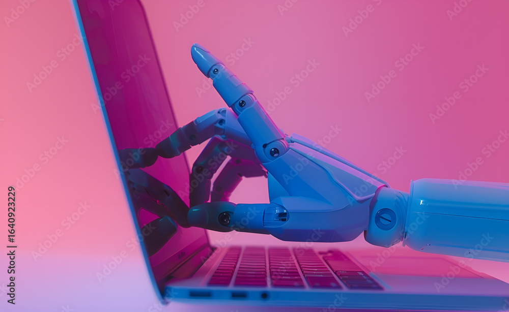 Różowy - Dłoń robota pisząca na laptopie w neonowym świetle. Symbol sztucznej inteligencji, automatyzacji... #1640923229