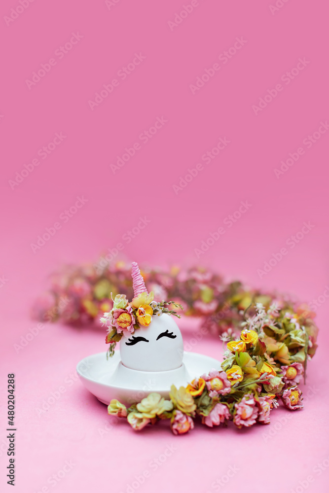 Różowy - wielkanocna pisanka jednorożec na różowym tle #480204288