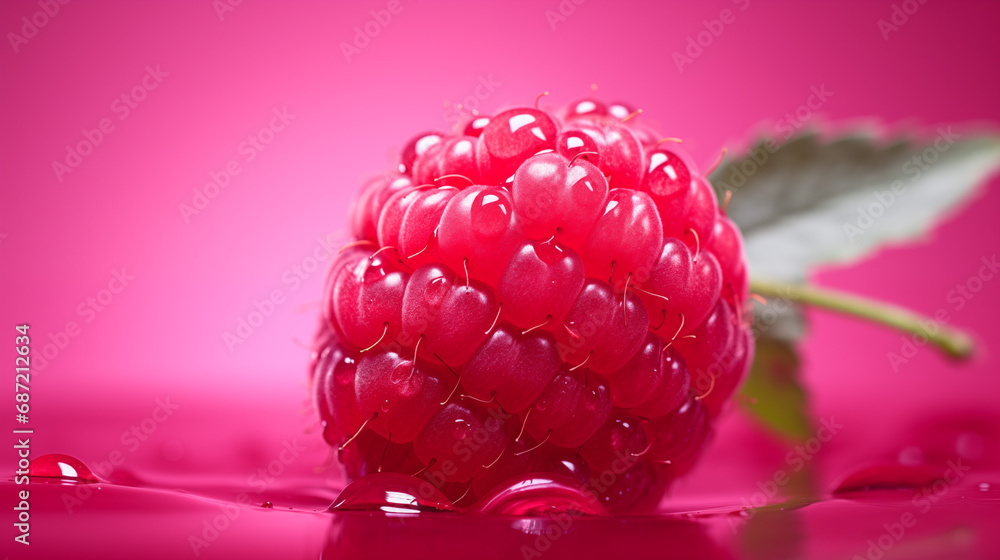 Różowy - Malina soczysta, piękna, świeża na różowym tle z kroplami wody i listkiem. #687212634
