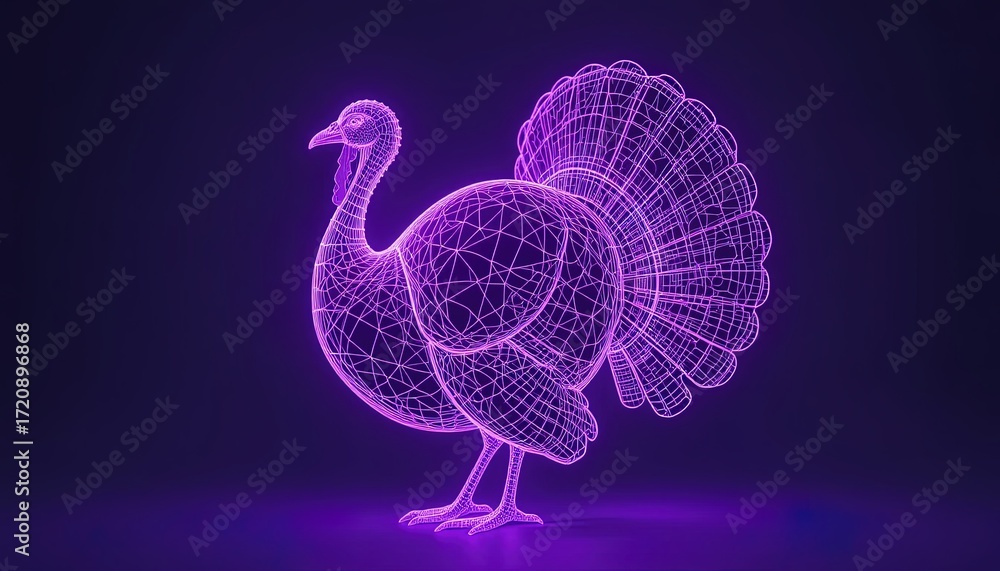 • A vibrant, glowing wireframe turkey, highlighted in a deep violet light, showcases intricate details of its form against a dark backdrop.