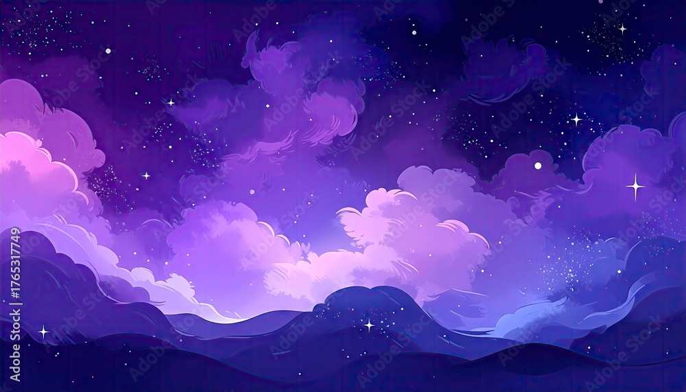 • Dreamy Purple Nightscape - Starry Sky and Mountain Silhouette.