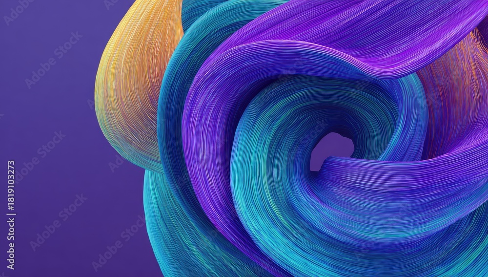 • Curvy swirl with bright yellow, blue, & purple strands on violet background
