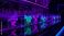 • Casting centered row of highball and wine glasses glowing on polished bar counter, with neon swirls