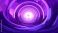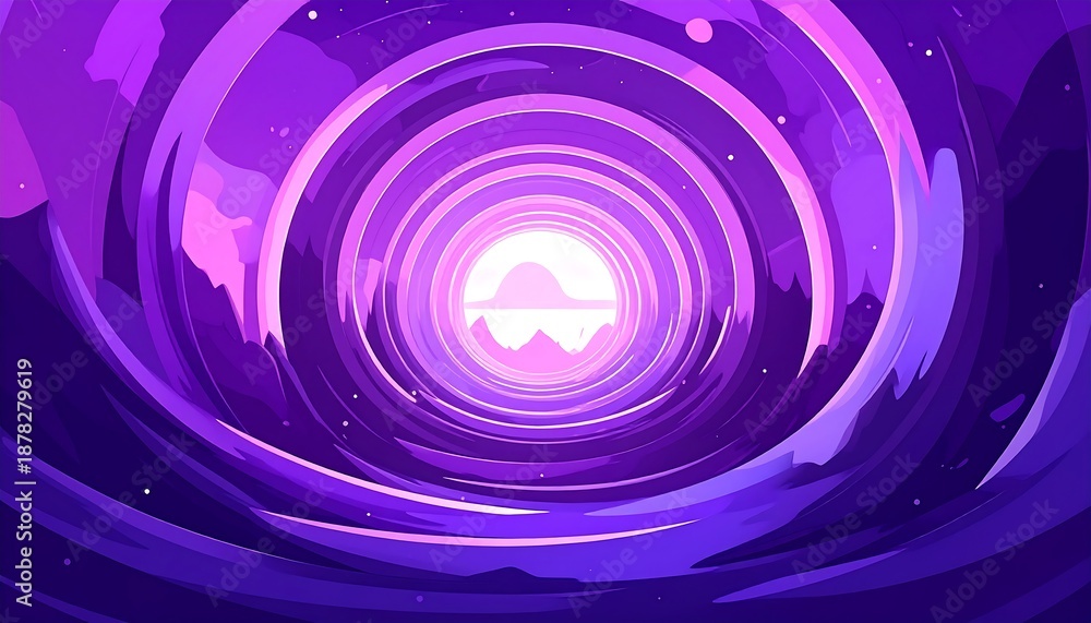 • A stylized tunnel of swirling purple and violet hues leads to a bright, mountainous horizon. Celestial shapes dot the background