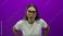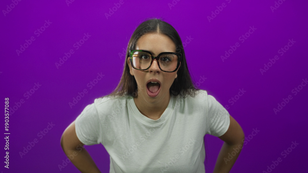 • Young brunette woman wearing oversized glasses with mouth open gasping and hands on hips in studio with purple backdrop; surprise curiosity.