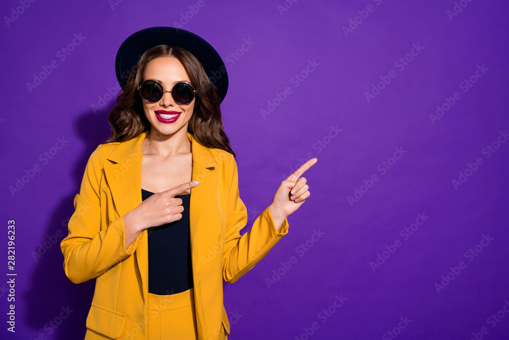 • Portrait of her she nice-looking lovely charming cute cheerful cheery wavy-haired lady pointing two forefingers aside ad isolated over bright vivid shine violet lilac purple background