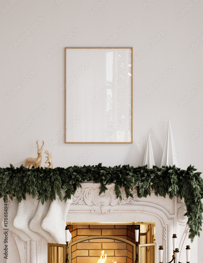 Owoce - Christmas poster frame mockup in Scandinavian interior with fireplace and decoration, 3d render #1786549409