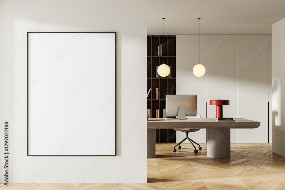 Owoce - Minimalist office interior with blank framed poster mockup on clean wall and modern workspace in... #1797027189