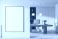 • Minimalist office interior with blank framed poster mockup on clean wall and modern workspace in bright neutral tones and wood texture backdrop. 3D Rendering