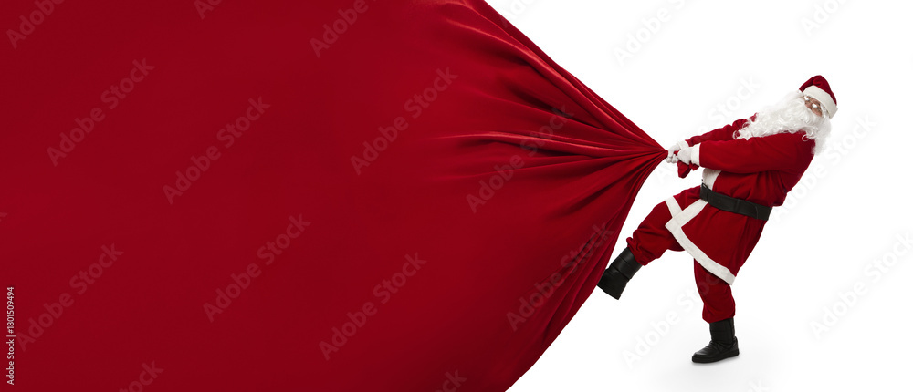 • Santa Claus pulling huge bag of presents isiolated on transparent background with copy space, png file