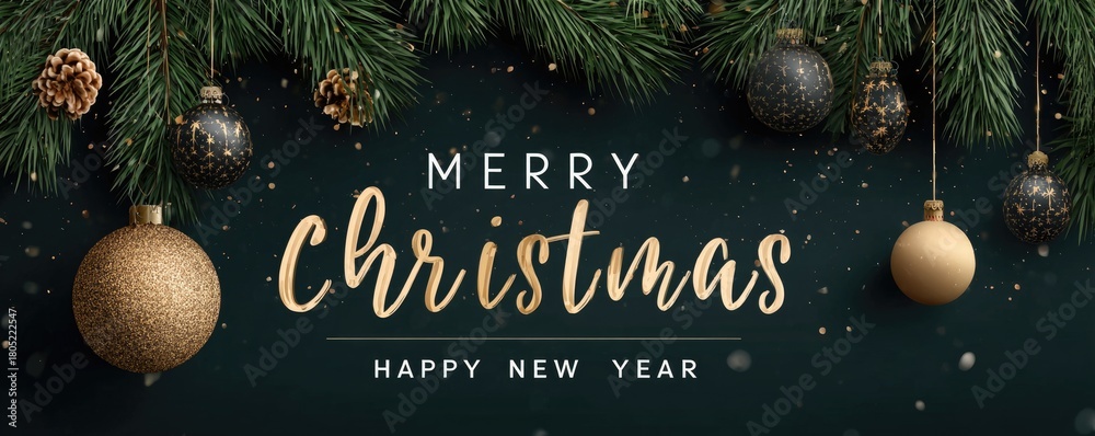• christmas greeting card with fir branch border and hanging decoration illustration