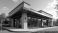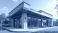 • Modern commercial building exterior with large glass windows and stone facade. Trees and green bushes surround the structure. Clear blue sky above.