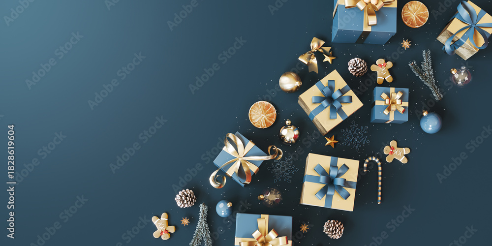 • Christmas decoration with Christmas presents on blue background with copy space. Christmas banner design. 3D Rendering, 3D Illustration