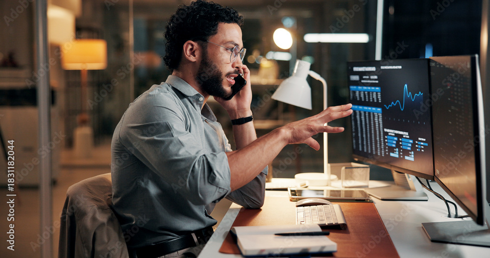 • Man, computer screen and phone call for trading, charts and stock market review at night. Person, smartphone and explain with graphs, talk and consultation with investment portfolio in dark office