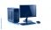 • A black desktop computer setup, including a tower case, monitor, keyboard, and mouse, sits on a reflective white surface.