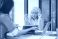 • Old asian businesswoman holding glasses talking to employee office worker at table in company room.